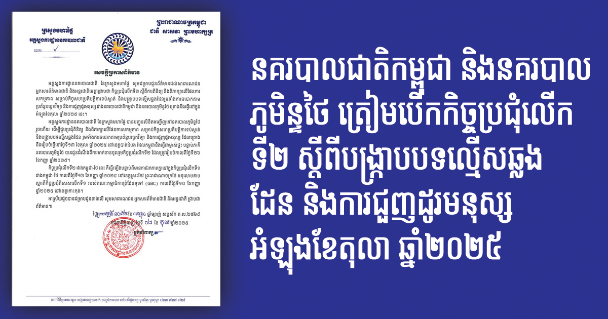 អគ្គស្នងការដ្ឋាននគរបាលជាតិ នៃក្រសួងមហាផ្ទៃ បានបញ្ជូនលិខិតអញ្ជើញទៅនគរបាលភូមិន្ទថៃ រួចហើយ ដើម្បីជួបប្រជុំពិនិត្យ និងពិភាក្សាលើផែនការសកម្មភាព សម្រាប់កិច្ចសហប្រតិបត្តិការទប់ស្កាត់ និងបង្ក្រាបបទល្មើសឆ្លងដែន រួមទាំងការឆបោកតាមប្រព័ន្ធបច្ចេកវិទ្យា និងការជួញដូរមនុស្ស ដែលគ្រោង នឹងរៀបចំធ្វើនៅថ្ងៃទី១៣ ខែតុលា ឆ្នាំ២០២៥ នៅខេត្តបាត់ដំបង ដែលកម្ពុជានឹងធ្វើជាម្ចាស់ផ្ទះ បន្ទាប់ភាគី នគរបាលភូមិន្ទថៃ បានជូនដំណឹងពីការអាក់ខានចូលរួមកិច្ចប្រជុំលើកទី២ ដែលត្រូវរៀបចំកាលពីថ្ងៃទី២៦ ខែកញ្ញា ឆ្នាំ២០២៥។