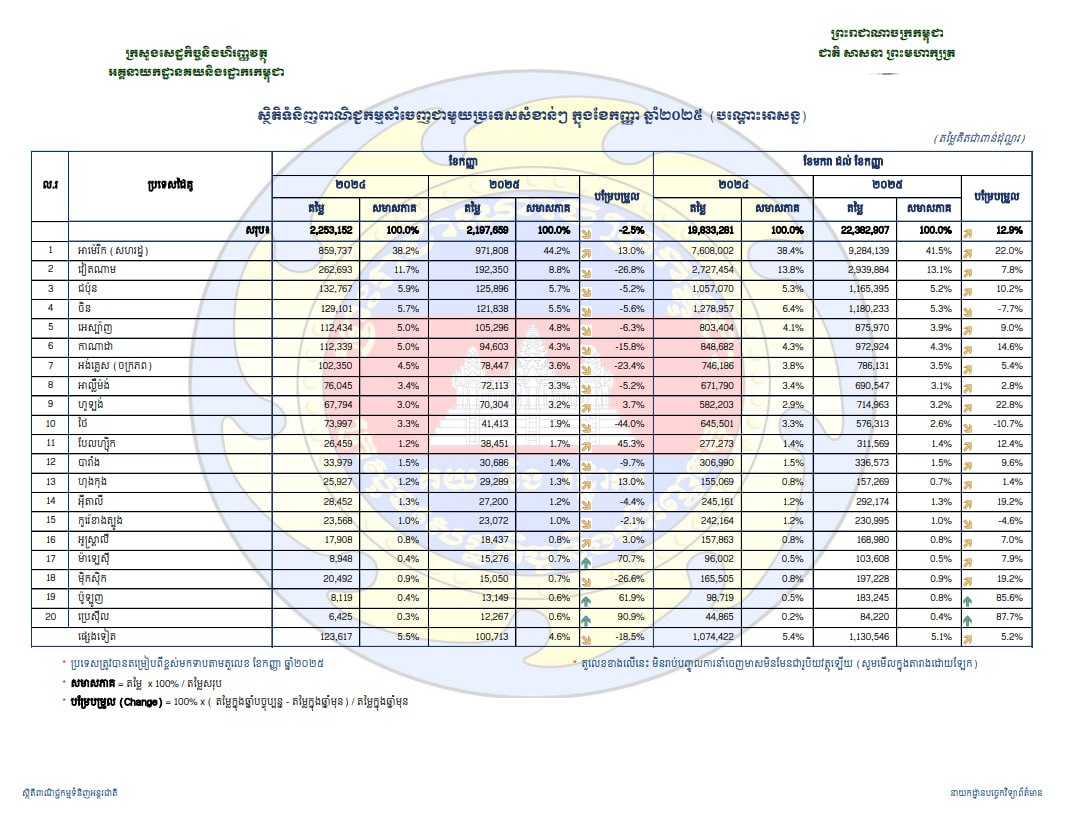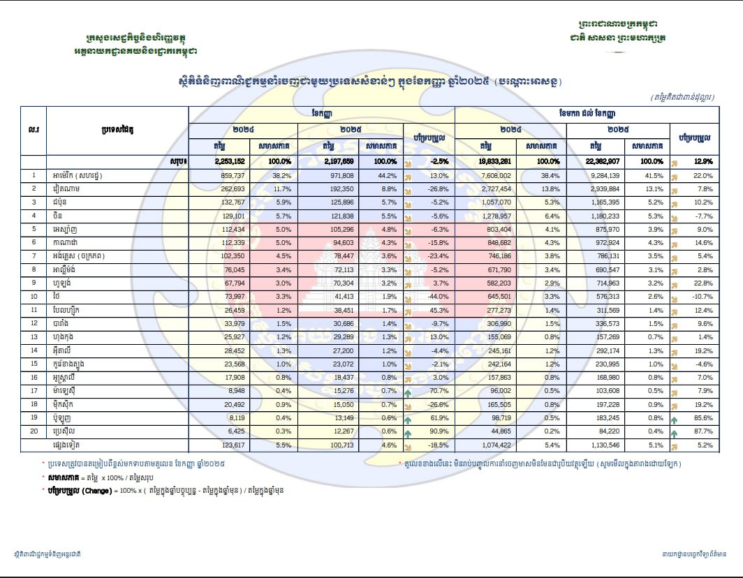 ទិន្នន័យបានឱ្យដឹងដែរថា ចំណែកនាំចេញពីកម្ពុជាទៅកាន់ថៃ មានតម្លៃ ៤១លានដុល្លារ ថយចុះ ៤៤% បើធៀបនឹងកាលពីខែកញ្ញា ឆ្នាំ២០២៤ ដែលមានតម្លៃជាង ៧៣លានដុល្លារ និងធៀបជាមួយនឹងខែសីហា ឆ្នាំ២០២៥ ថយចុះប្រមាណ ៥លានដុល្លារ ដែលកាលពីខែសីហាកន្លងទៅនេះ កម្ពុជានាំចេញទំនិញជាង ៤៦លានដុល្លារទៅថៃ។