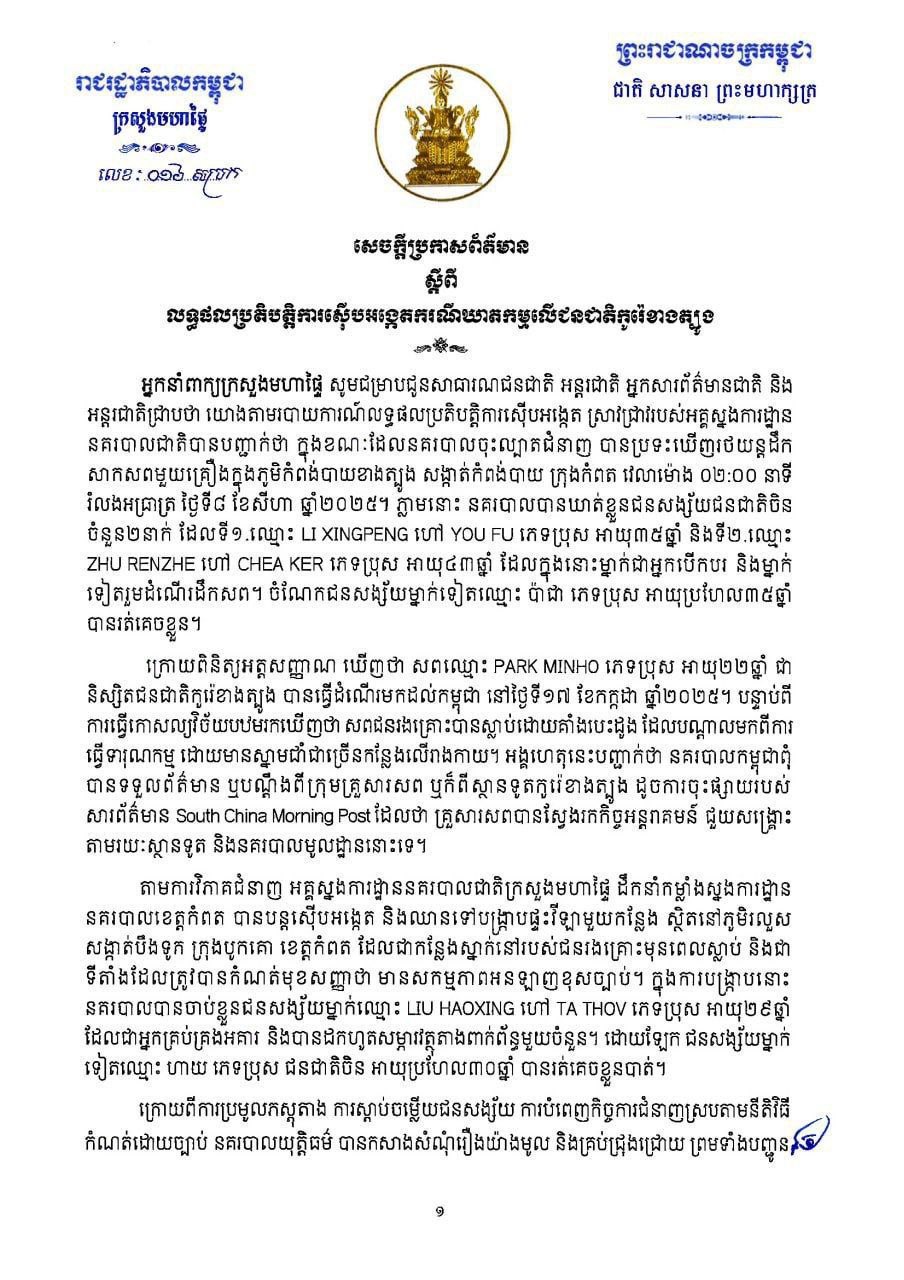 ក្រោយពិនិត្យអត្តសញ្ញាណ ឃើញថា សពឈ្មោះ PARK MINHO ភេទប្រុស អាយុ២២ឆ្នាំ ជា និស្សិតជនជាតិកូរ៉េខាងត្បូង បានធ្វើដំណើរមកដល់កម្ពុជា នៅថ្ងៃទី១៧ ខែកក្កដា ឆ្នាំ២០២៥។ បន្ទាប់ពី ការធ្វើកោសល្យវិច័យបឋមរកឃើញថា សពជនរងគ្រោះបានស្លាប់ដោយគាំងបេះដូង ដែលបណ្តាលមកពីការ ធ្វើទារុណកម្ម ដោយមានស្នាមជាំជាច្រើនកន្លែងលើរាងកាយ។ អង្គហេតុនេះបញ្ជាក់ថា នគរបាលកម្ពុជាពុំ បានទទួលព័ត៌មាន ឬបណ្ដឹងពីក្រុមគ្រួសារសព ឬក៏ពីស្ថានទូតកូរ៉េខាងត្បូង ដូចការចុះផ្សាយរបស់ សារព័ត៌មាន South China Morning Post ដែលថា គ្រួសារសពបានស្វែងរកកិច្ចអន្តរាគមន៍ ជួយសង្គ្រោះ តាមរយៈស្ថានទូត និងនគរបាលមូលដ្ឋាននោះទេ។