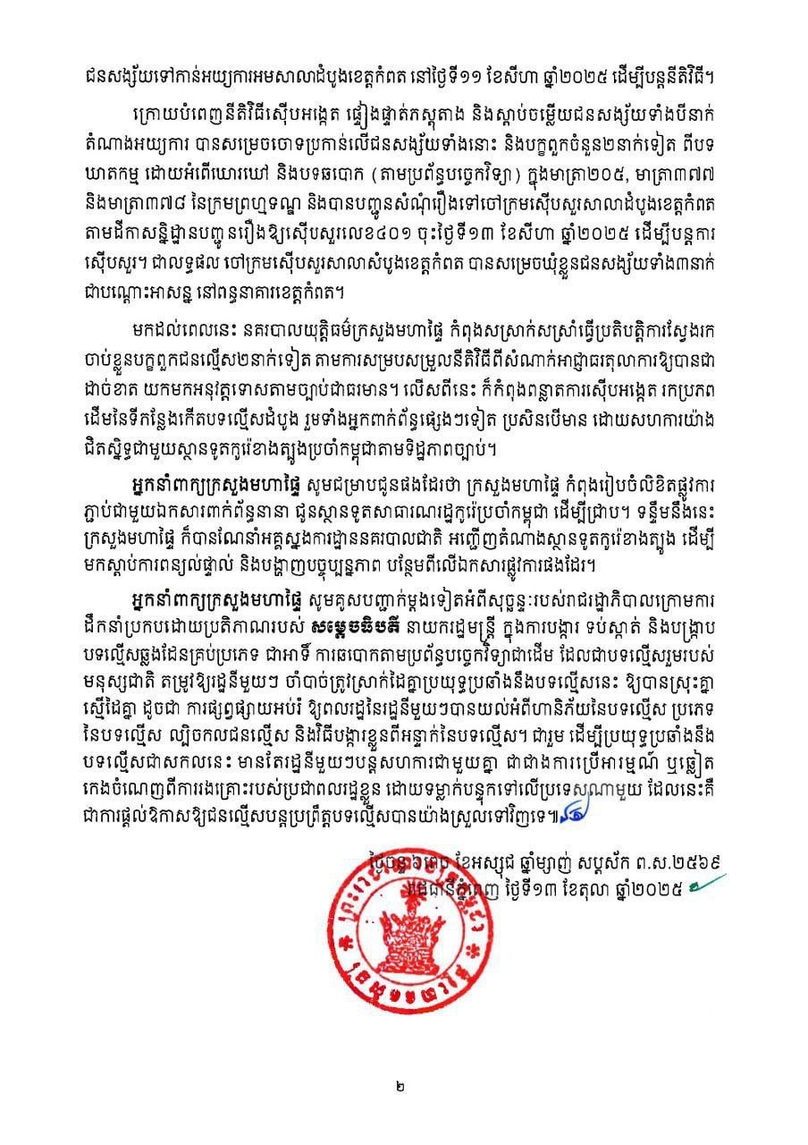 ខាងក្រោមនេះ ជាសេចក្ដីប្រកាសព័ត៌មានរបស់ក្រសួងមហាផ្ទៃ៖