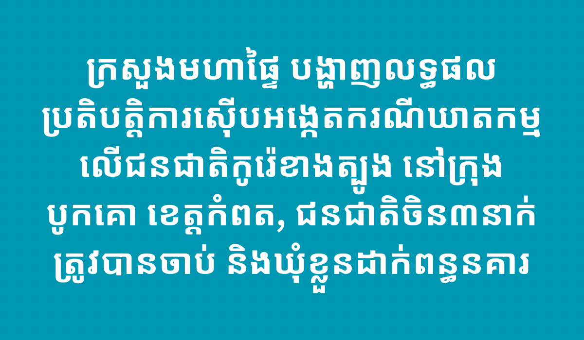 ក្រសួងមហាផ្ទៃ បង្ហាញលទ្ធផលប្រតិបត្តិការស៊ើបអង្កេតករណីឃាតកម្មលើជនជាតិកូរ៉េខាងត្បូង នៅក្រុងបូកគោ ខេត្តកំពត, ជនជាតិចិន៣នាក់ ត្រូវបានចាប់ និងឃុំខ្លួនដាក់ពន្ធនគារ