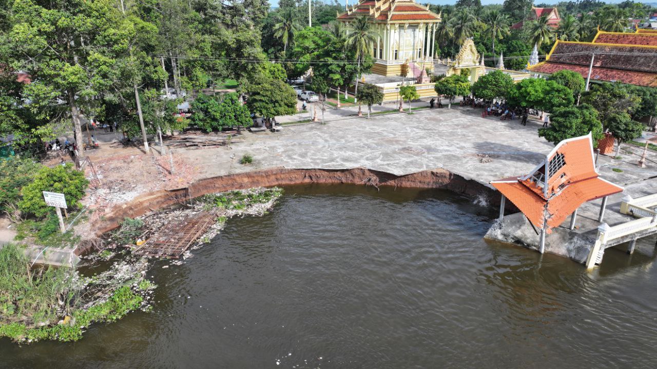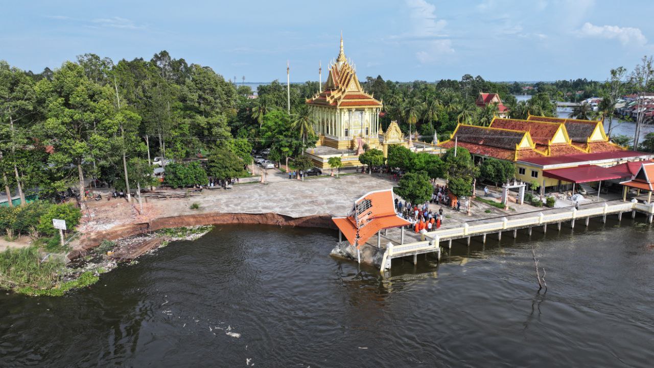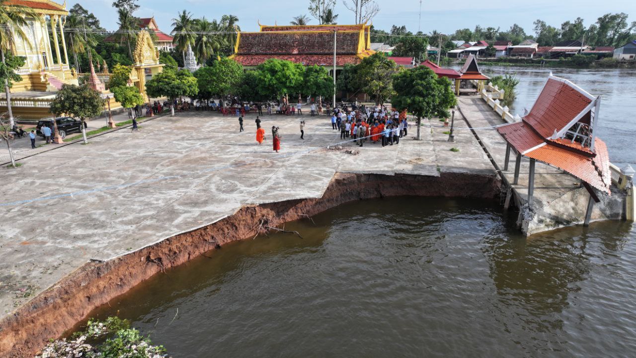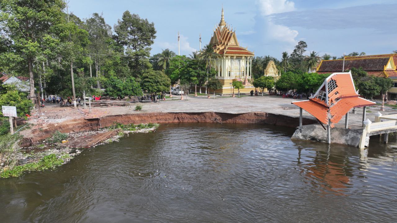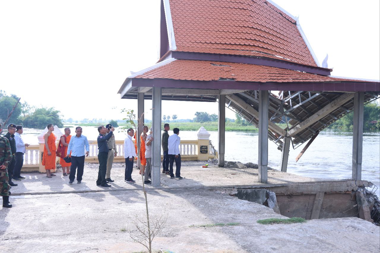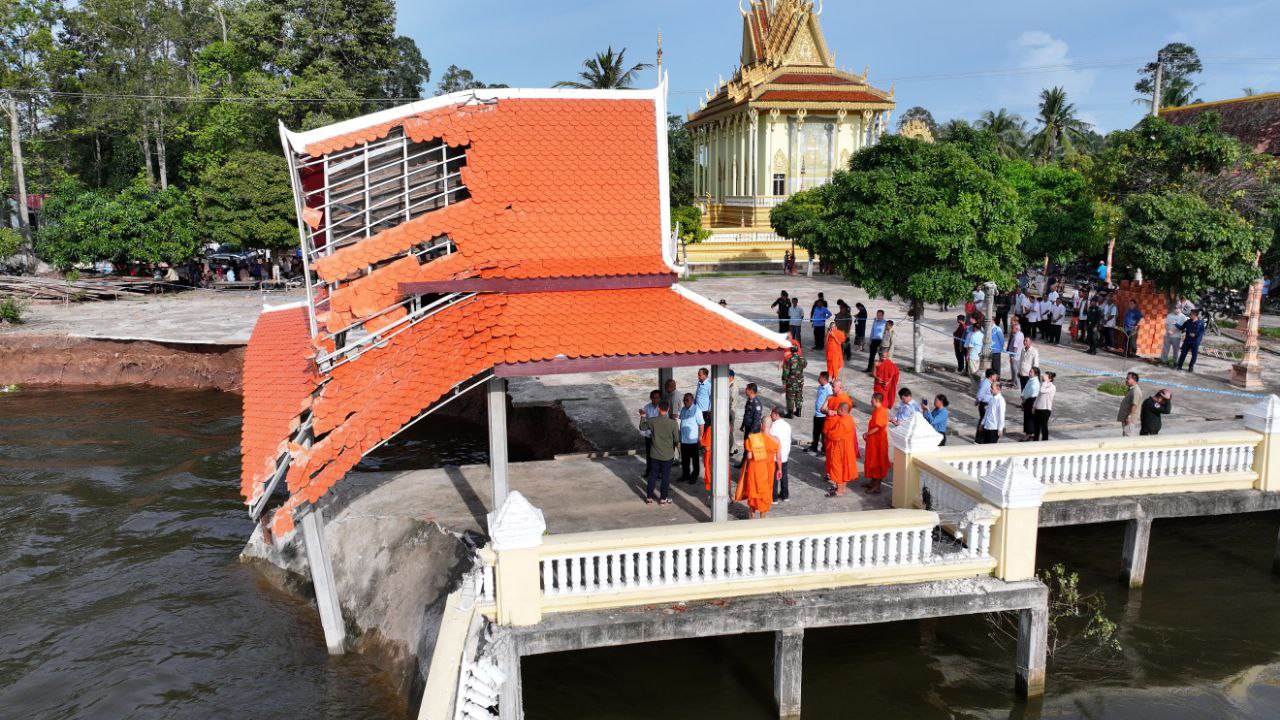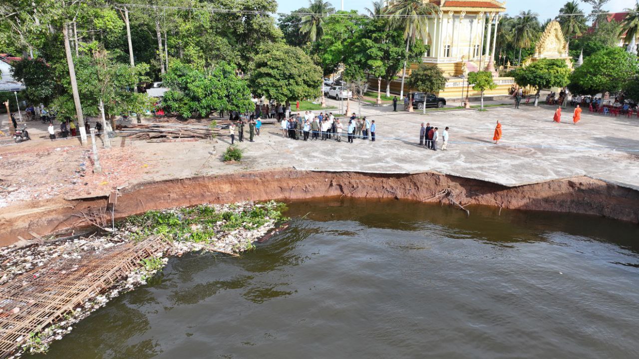 ខេត្តកណ្តាល៖ ច្រាំងមាត់ស្ទឹង ស្ថិតក្នុងឃុំលើកដែក រងការបាក់ស្រុត បណ្តាលមកពីទឹកទន្លេមេគង្គ និងទឹកទន្លេបាសាក់ហូរចូលតាមព្រែកលើកដែក មកប្រសព្វត្រង់ចំណុចមុខវត្តជ្រោយស្ថិតនៅក្នុងភូមិសាស្ត្រស្រុកកោះធំ នារសៀលថ្ងៃទី២១ ខែតុលា ឆ្នាំ២០២៥នេះត្រូវបាន ឯកឧត្តមគួច ចំរើន អភិបាល នៃគណៈអភិបាលខេត្តកណ្តាល ដឹកនាំមន្ទីរជំនាញ មន្ត្រីបច្ចេកទេស អាជ្ញាធរដែនដី ព្រះសង្ឃ និងប្រជាពលរដ្ឋចំណុះជើងវត្ត ចុះពិនិត្យជាក់ស្តែងទីតាំងមាត់ស្ទឹងលើកដែកដែលរងការបាក់ច្រាំង នៅចំណុចវត្តជ្រោយ ភូមិអន្លង់ស្លាត ឃុំលើកដែក ស្រុកកោះធំខេត្តកណ្តាល។