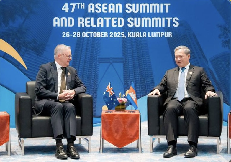 នារសៀល ថ្ងៃទី២៧ ខែតុលា ឆ្នាំ២០២៥, សម្តេចមហាបវរធិបតី ហ៊ុន ម៉ាណែត នាយករដ្ឋមន្រ្តី នៃព្រះរាជាណាចក្រកម្ពុជា និង ឯកឧត្តម Anthony Albanese នាយករដ្ឋមន្ត្រីអូស្ត្រាលី បានជួបពិភាក្សាការងារទ្វេភាគី ក្នុងឱកាសចូលរួមកិច្ចប្រជុំកំពូលអាស៊ាន លើកទី៤៧ និងកិច្ចប្រជុំកំពូលពាក់ព័ន្ធ នៅទីក្រុងគូឡាឡាំពួ ប្រទេសម៉ាឡេស៊ី នៅថ្ងៃទី២៦-២៨ ខែតុលា ឆ្នាំ២០២៥។
