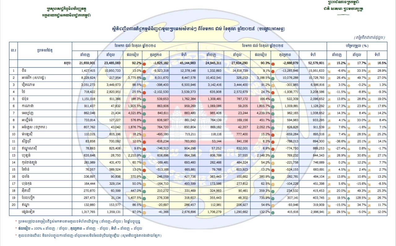 ទិន្នន័យបានឱ្យដឹងដែរថា ចំណែកនាំចេញពីកម្ពុជាទៅកាន់ថៃ មានតម្លៃ ៥៩លានដុល្លារ ថយចុះ៧.៥% បើធៀបនឹងកាលពីខែតុលា ឆ្នាំ២០២៤ ដែលមានតម្លៃជាង ៦២លានដុល្លារ។