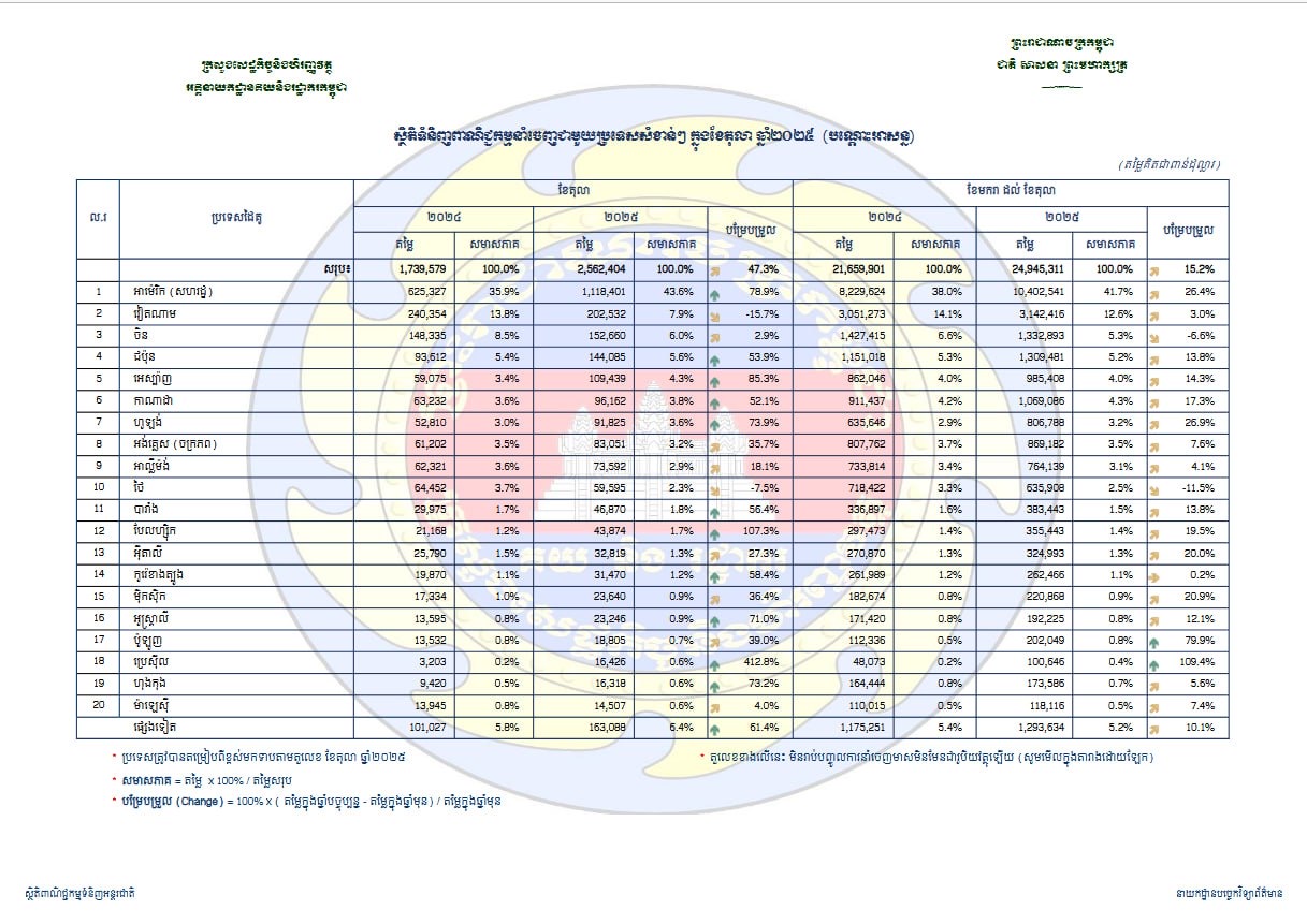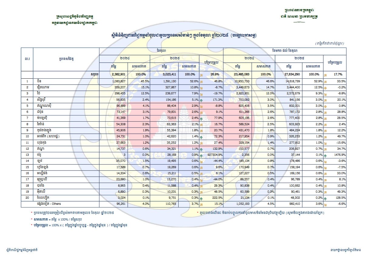ទិន្នន័យបានឱ្យដឹងដែរថា ចំណែកនាំចេញពីកម្ពុជាទៅកាន់ថៃ មានតម្លៃ ៥៩លានដុល្លារ ថយចុះ៧.៥% បើធៀបនឹងកាលពីខែតុលា ឆ្នាំ២០២៤ ដែលមានតម្លៃជាង ៦២លានដុល្លារ។