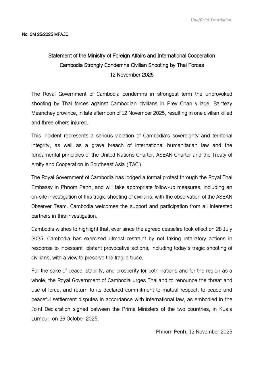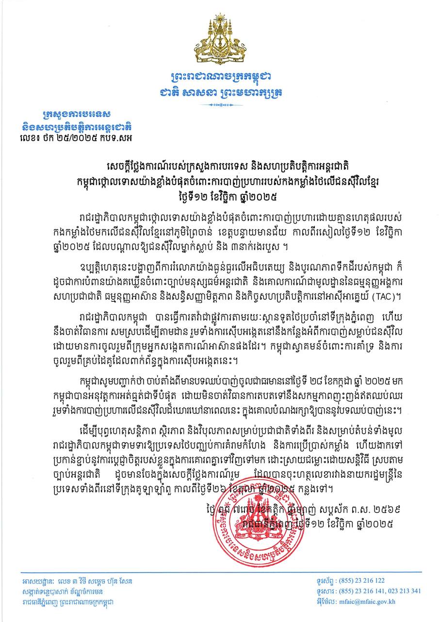កម្ពុជាសូមបញ្ជាក់ថា ចាប់តាំងពីមានបទឈប់បាញ់ចូលជាធរមាននៅថ្ងៃទី ២៨ ខែកក្កដា ឆ្នាំ ២០២៥ មក កម្ពុជាបានអនុវត្តការអត់ធ្មត់ជាទីបំផុត ដោយមិនចាត់វិធានការតបតទៅនឹងសកម្មភាពញុះញង់ឥតឈប់ឈរ រួមទាំងការបាញ់ប្រហារលើជនស៊ីវិលដ៏ឃោរឃៅនាពេលនេះ ក្នុងគោលបំណងរក្សាឱ្យបាននូវបទឈប់បាញ់នេះ។