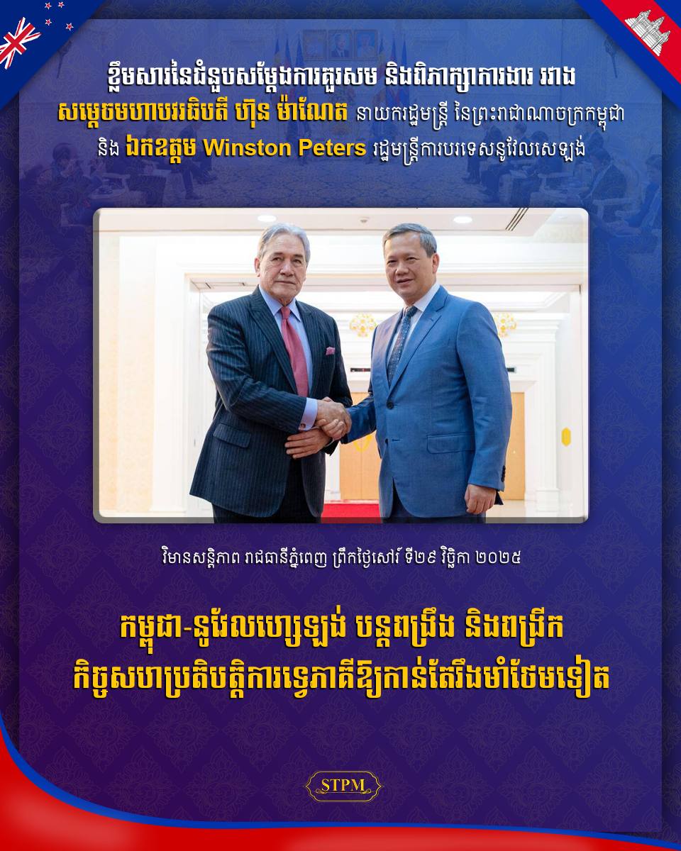 (ភ្នំពេញ)៖ នាព្រឹកថ្ងៃទី២៩ ខែវិច្ឆិកា ឆ្នាំ២០២៥, សម្តេចមហាបវរធិបតី ហ៊ុន ម៉ាណែត នាយករដ្ឋមន្ត្រី នៃព្រះរាជាណាចក្រកម្ពុជា បានអនុញ្ញាតឱ្យ លោក Winston Peters រដ្ឋមន្ត្រីការបរទេសនូវែលសេឡង់ និង គណៈប្រតិភូចូលជួបសម្ដែងការគួរសម និងពិភាក្សាការងារ នៅវិមានសន្តិភាព។