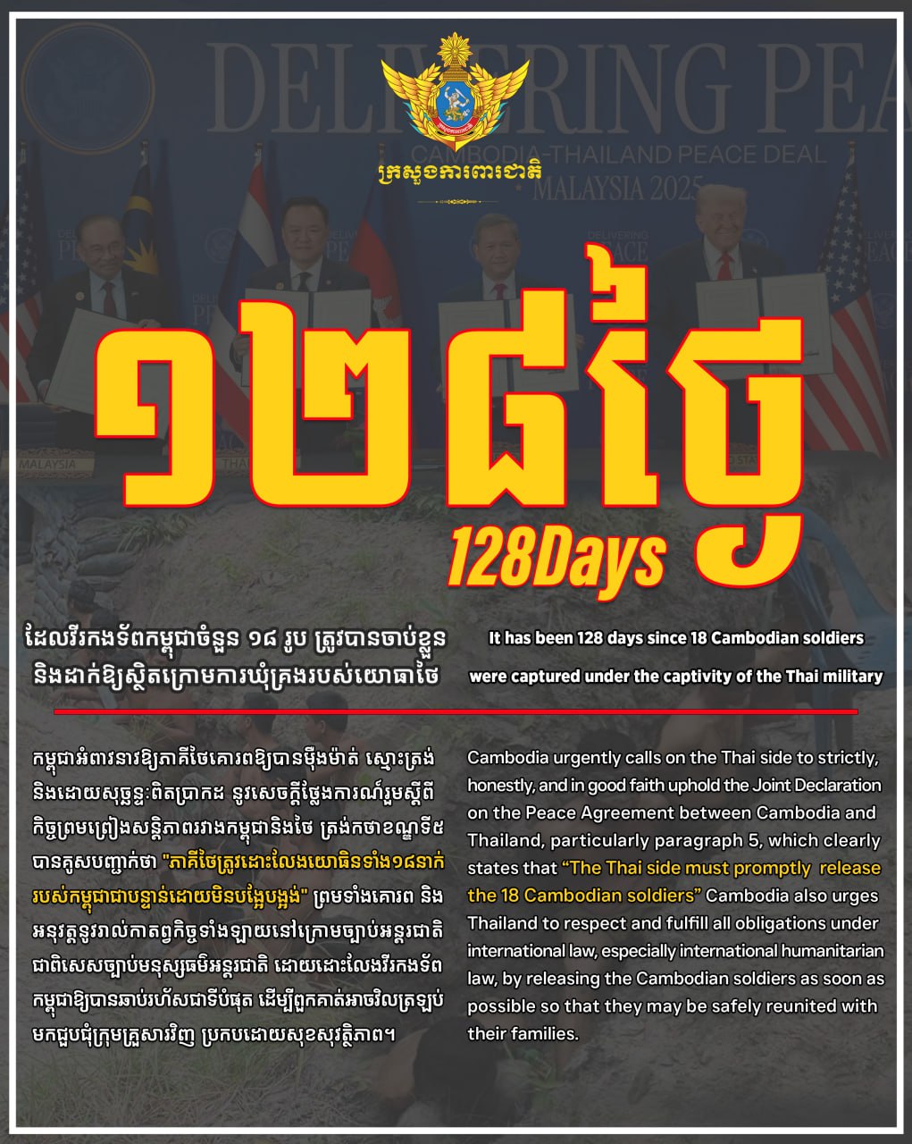 កម្ពុជាអំពាវនាវឱ្យភាគីថៃគោរពឱ្យបានម៉ឺងម៉ាត់ ស្មោះត្រង់ និងដោយសុច្ឆន្ទៈពិតប្រាកដ នូវសេចក្តីថ្លែងការណ៍រួមស្តីពីកិច្ចព្រមព្រៀងសន្តិភាពរវាងកម្ពុជានិងថៃ ត្រង់កថាខណ្ឌទី៥ បានគូសបញ្ជាក់ថា “ភាគីថៃត្រូវដោះលែងយោធិនទាំង១៨នាក់របស់កម្ពុជាជាបន្ទាន់ដោយមិនបង្អែបង្អង់” ព្រមទាំងគោរពនិងអនុវត្តនូវរាល់កាតព្វកិច្ចទាំងឡាយនៅក្រោមច្បាប់អន្តរជាតិ ជាពិសេសច្បាប់មនុស្សធម៌អន្តរជាតិ ដោយដោះលែងវីរកងទ័ពកម្ពុជាឱ្យបានឆាប់រហ័សជាទីបំផុត ដើម្បីពួកគាត់អាចវិលត្រឡប់មកជួបជុំក្រុមគ្រួសារវិញ ប្រកបដោយសុខសុវត្ថិភាព។