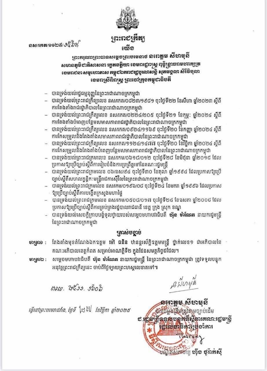 (ភ្នំពេញ)៖ ព្រះមហាក្សត្រនៃកម្ពុជា បានចេញព្រះរាជក្រឹត្យត្រាស់បង្គាប់តែងតាំង លោក ម៉ៅ ធនិន ជាអភិបាលខេត្តកំពត សម្រាប់អាណត្តិទី២ នេះបើយោងតាមព្រះរាជក្រឹត្យដែលបណ្តាញព័ត៌មាន Fresh News ទើបទទួលបាននៅល្ងាចថ្ងៃទី០៤ ខែធ្នូ ឆ្នាំ២០២៥។
