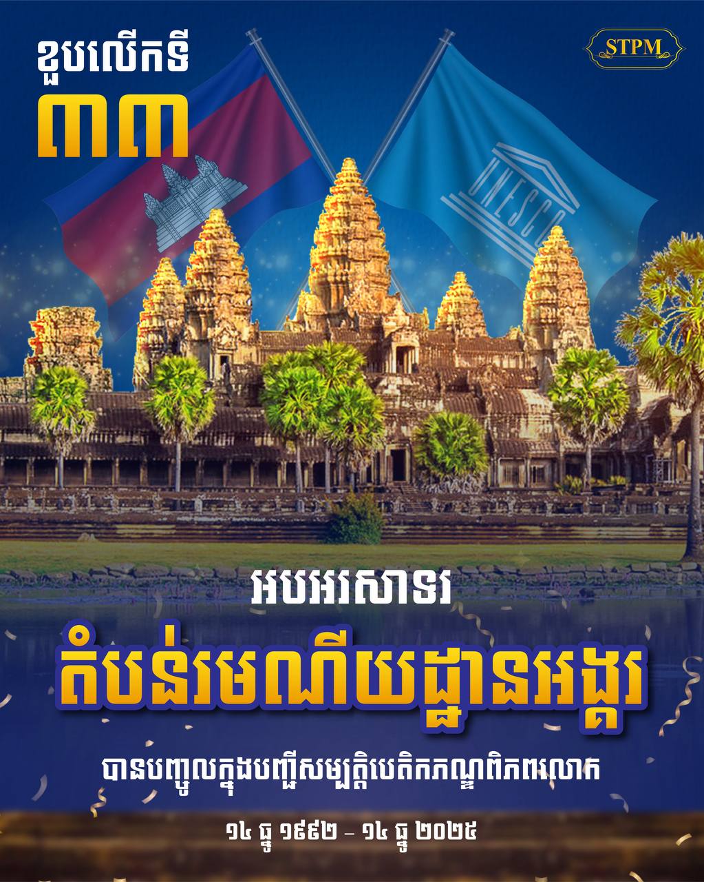 (ភ្នំពេញ)៖ នៅថ្ងៃទី១៤ ខែធ្នូ ឆ្នាំ២០២៥នេះ គឺជាខួបលើកទី៣៣ឆ្នាំ នៃការដាក់បញ្ចូលរមណីយដ្ឋានអង្គរ ក្នុងបញ្ជីបេតិកភណ្ឌពិភពលោក របស់អង្គការយូណេស្កូ (១៤ ធ្នូ ១៩៩២ – ១៤ ធ្នូ ២០២៥)។