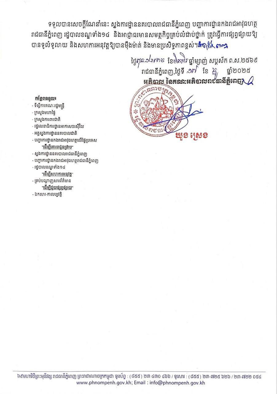 ទទួលបានសេចក្តីណែនាំនេះ ស្នងការដ្ឋាននគរបាលរាជធានីភ្នំពេញ បញ្ជាការដ្ឋានកងរាជអាវុធហត្ថរាជធានីភ្នំពេញ រដ្ឋបាលខណ្ឌទាំង១៤ និងអាជ្ញាធរមានសមត្ថកិច្ចគ្រប់លំដាប់ថ្នាក់ ត្រូវធ្វើការផ្សព្វផ្សាយឱ្យបានទូលំទូលាយ និងសហការអនុវត្តឱ្យបានម៉ឺងម៉ាត់ និងមានប្រសិទ្ធភាពខ្ពស់៕