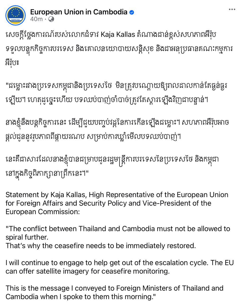 សេចក្តីថ្លែងការណ៍របស់លោកស្រី Kaja Kallas បានបញ្ជាក់ថា៖ «ជម្លោះរវាងប្រទេសកម្ពុជានិងប្រទេសថៃ មិនត្រូវបណ្តោយឱ្យរាលដាលកាន់តែធ្ងន់ធ្ងរឡើយ។ ហេតុដូច្នេះហើយ បទឈប់បាញ់ចាំបាច់ត្រូវតែស្តារឡើងវិញជាបន្ទាន់។ នាងខ្ញុំនឹងបន្តកិច្ចការនេះ ដើម្បីជួយបញ្ចប់វដ្ដនៃការកើនឡើងជម្លោះ។ សហភាពអឺរ៉ុបអាចផ្តល់ជូននូវរូបភាពពីផ្កាយរណប សម្រាប់ការឃ្លាំមើលបទឈប់បាញ់។ នេះគឺជាសារដែលនាងខ្ញុំបានជម្រាបជូនរដ្ឋមន្ត្រីការបរទេសនៃប្រទេសថៃ និងកម្ពុជា នៅក្នុងកិច្ចពិភាក្សានាព្រឹកនេះ»៕