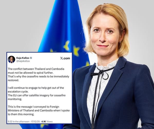 សេចក្តីថ្លែងការណ៍របស់លោកស្រី Kaja Kallas បានបញ្ជាក់ថា៖ «ជម្លោះរវាងប្រទេសកម្ពុជានិងប្រទេសថៃ មិនត្រូវបណ្តោយឱ្យរាលដាលកាន់តែធ្ងន់ធ្ងរឡើយ។ ហេតុដូច្នេះហើយ បទឈប់បាញ់ចាំបាច់ត្រូវតែស្តារឡើងវិញជាបន្ទាន់។ នាងខ្ញុំនឹងបន្តកិច្ចការនេះ ដើម្បីជួយបញ្ចប់វដ្ដនៃការកើនឡើងជម្លោះ។ សហភាពអឺរ៉ុបអាចផ្តល់ជូននូវរូបភាពពីផ្កាយរណប សម្រាប់ការឃ្លាំមើលបទឈប់បាញ់។ នេះគឺជាសារដែលនាងខ្ញុំបានជម្រាបជូនរដ្ឋមន្ត្រីការបរទេសនៃប្រទេសថៃ និងកម្ពុជា នៅក្នុងកិច្ចពិភាក្សានាព្រឹកនេះ»៕