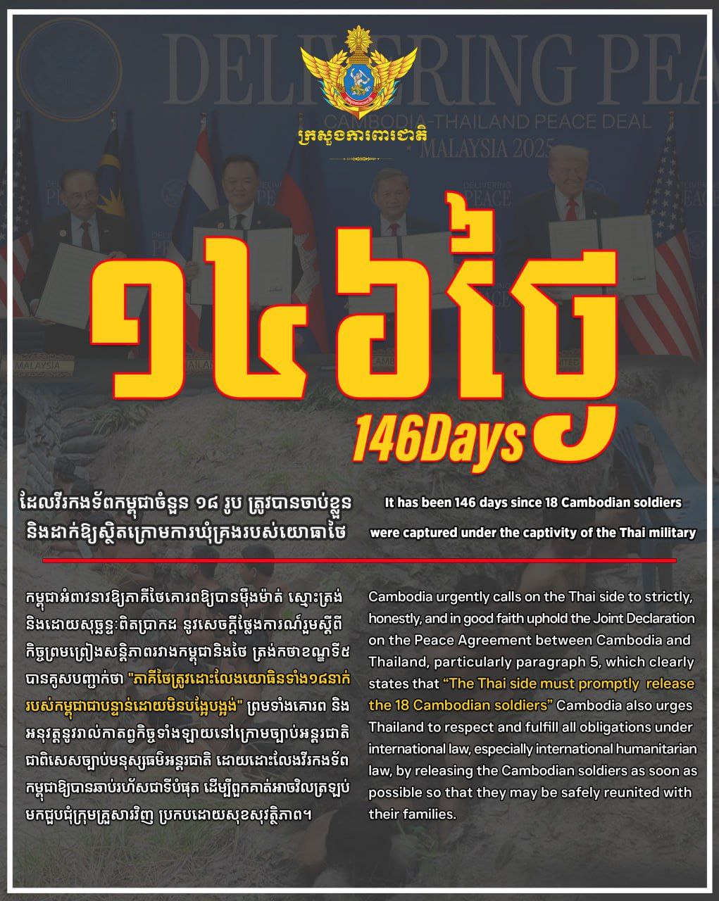 កម្ពុជាអំពាវនាវឱ្យភាគីថៃគោរពឱ្យបានម៉ឺងម៉ាត់ ស្មោះត្រង់ និងដោយសុច្ឆន្ទៈពិតប្រាកដ នូវសេចក្តីថ្លែងការណ៍រួមស្តីពីកិច្ចព្រមព្រៀងសន្តិភាពរវាងកម្ពុជានិងថៃ ត្រង់កថាខណ្ឌទី៥ បានគូសបញ្ជាក់ថា “ភាគីថៃត្រូវដោះលែងយោធិនទាំង១៨នាក់របស់កម្ពុជាជាបន្ទាន់ដោយមិនបង្អែបង្អង់” ព្រមទាំងគោរពនិងអនុវត្តនូវរាល់កាតព្វកិច្ចទាំងឡាយនៅក្រោមច្បាប់អន្តរជាតិ ជាពិសេសច្បាប់មនុស្សធម៌អន្តរជាតិ ដោយដោះលែងវីរកងទ័ពកម្ពុជាឱ្យបានឆាប់រហ័សជាទីបំផុត ដើម្បីពួកគាត់អាចវិលត្រឡប់មកជួបជុំក្រុមគ្រួសារវិញ ប្រកបដោយសុខសុវត្ថិភាព។