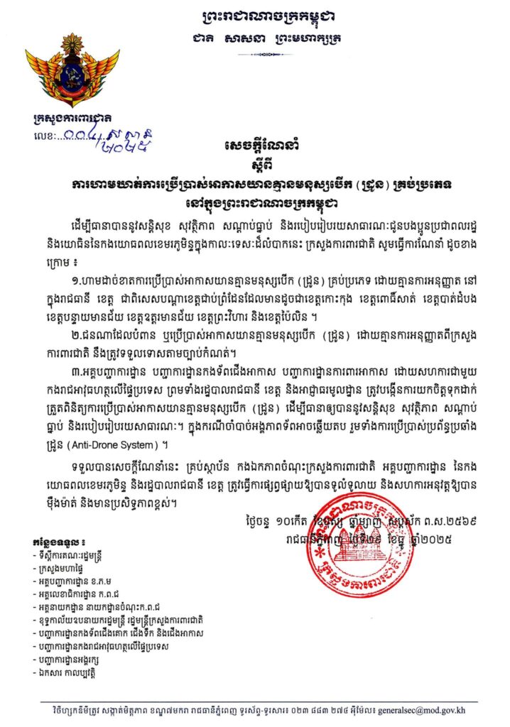 ក្រសួងការពារជាតិ ហាមដាច់ខាតការបង្ហោះដ្រូននៅទូទាំងប្រទេស និងណែនាំឲ្យអង្គភាពពាក់ព័ន្ធអាចប្រើប្រាស់ប្រព័ន្ធប្រឆាំងដ្រូនក្នុងករណីចាំបាច់