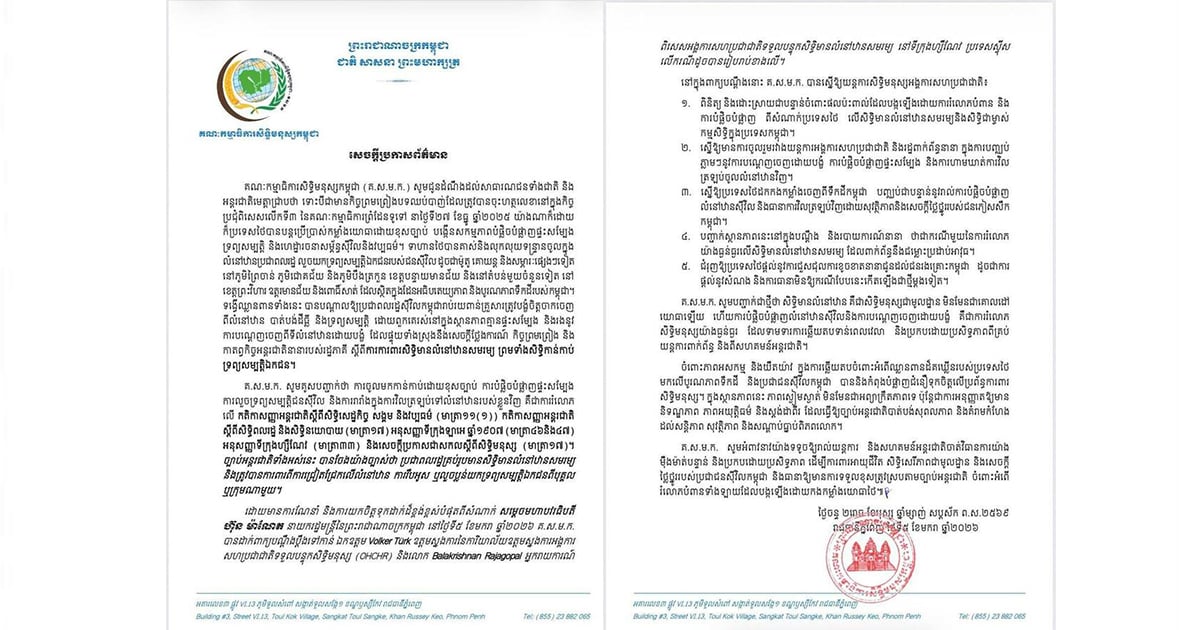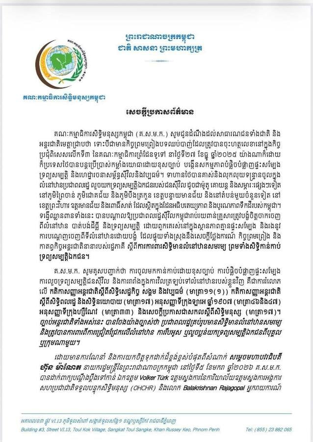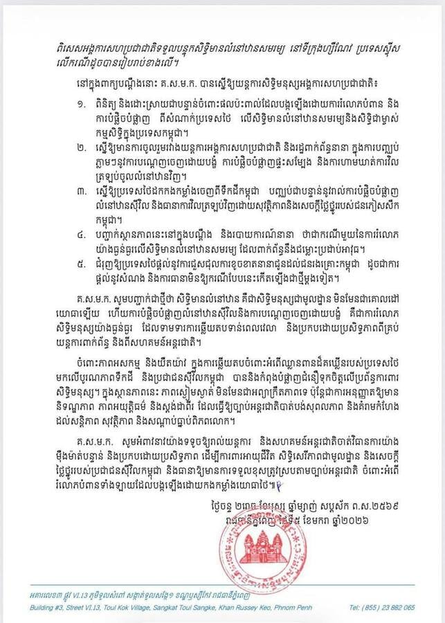 គណៈកម្មាធិការសិទ្ធិមនុស្សកម្ពុជា ដាក់ពាក្យបណ្តឹង ទៅកាន់យន្តការសិទ្ធិមនុស្សនៃអង្គការសហប្រជាជាតិ ទាមទារឱ្យចាត់វិធានការចំពោះការរំលោភសិទ្ធិមានលំនៅឋាន និងសិទ្ធិកាន់កាប់ទ្រព្យសម្បត្តិឯកជនរបស់ប្រជាពលរដ្ឋកម្ពុជា ដែលបង្កឡើងដោយយោធាថៃ