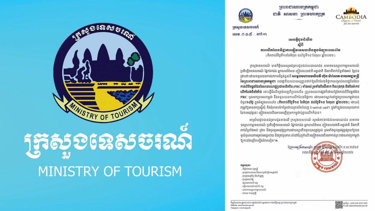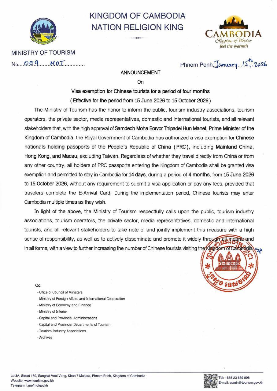 តាមរយៈសេចក្ដីជូនដំណឹងរបស់ក្រសួងទេសចរណ៍ បានបញ្ជាក់ថា ដោយទទួលបានការឯកភាពដ៏ខ្ពង់ខ្ពស់ពី សម្តេចមហាបវរធិបតី ហ៊ុន ម៉ាណែត នាយករដ្ឋមន្ត្រីនៃកម្ពុជា រាជរដ្ឋាភិបាលបានអនុញ្ញាត ដាក់ឱ្យលើកលែងទិដ្ឋាការសម្រាប់ពលរដ្ឋចិនដែល កាន់លិខិតឆ្លងដែននៃសាធារណរដ្ឋប្រជាមានិតចិន (PRC) ទាំងអស់ រួមទាំងចិនដីគោក ចិនហុងកុង និងចិនម៉ាកាវ លើកលែងចិនតៃវ៉ាន់ ទោះធ្វើដំណើរត្រង់ចេញពីប្រទេសចិន ឬប្រទេសណាផ្សេងក៏ដោយឱ្យតែកាន់លិខិតឆ្លងដែន PRC ចូលមកប្រទេសកម្ពុជា នឹងទទួលបានការលើកលែងទិដ្ឋាការ ដោយអាចស្នាក់នៅក្នុងប្រទេសកម្ពុជាបាន ចំនួន១៤ថ្ងៃ ក្នុងអំឡុងពេល៤ខែ (គិតចាប់ពីថ្ងៃទី១៥ ខែមិថុនា ដល់ថ្ងៃទី១៥ ខែតុលា ឆ្នាំ២០២៦) ដោយពុំ តម្រូវឱ្យមានពាក្យស្នើសុំ និងពុំមានបង់កម្រៃដោយគ្រាន់តែបំពេញ E-arrival card។ ក្នុងកំឡុងពេលសុពលភាព នៃការអនុវត្តនេះ ភ្ញៀវទេសចរចិនអាចអញ្ជើញមកកម្ពុជាប៉ុន្មានលើកក៏បាន។