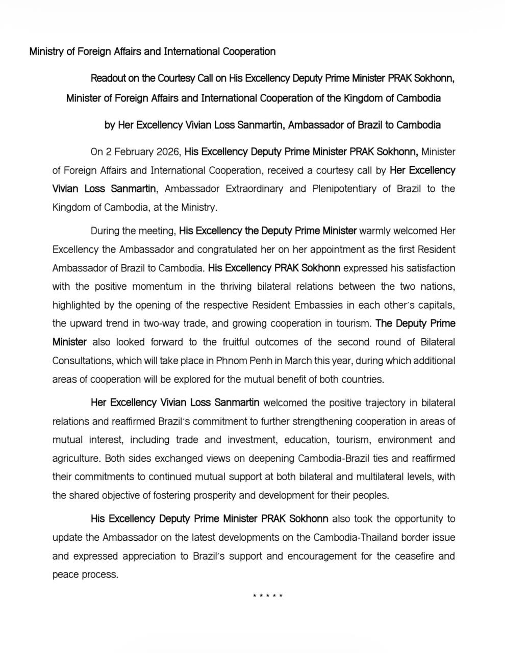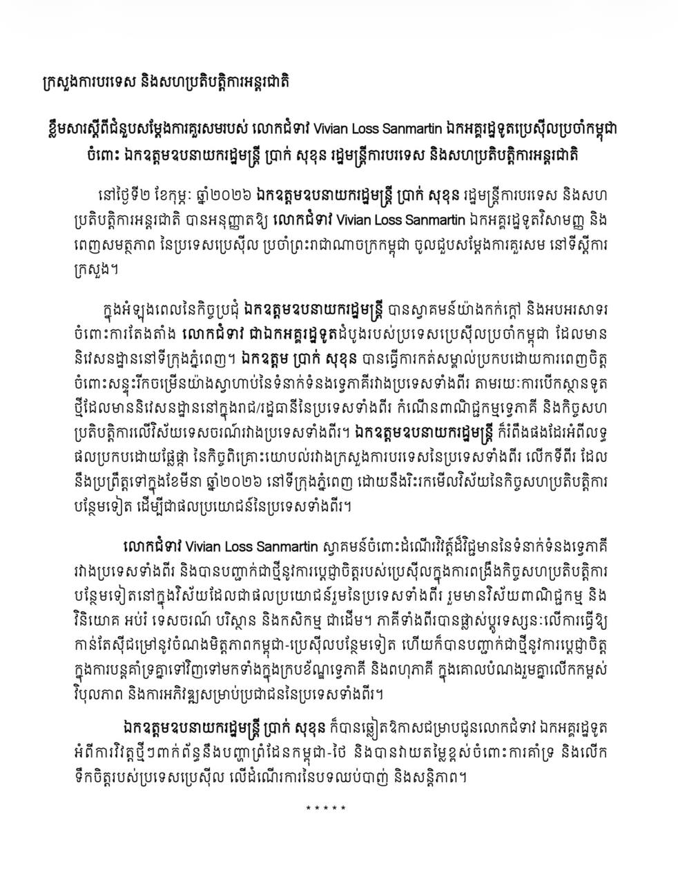 (ភ្នំពេញ)៖ លោកឧបនាយករដ្ឋមន្ត្រី ប្រាក់ សុខុន រដ្ឋមន្ត្រីការបរទេស និងសហ ប្រតិបត្តិការអន្តរជាតិ នៅថ្ងៃទី២ ខែកុម្ភៈ ឆ្នាំ២០២៦ បានអនុញ្ញាតឱ្យលោកស្រី Vivian Loss Sanmartin ឯកអគ្គរដ្ឋទូតវិសាមញ្ញ និងពេញសមត្ថភាព នៃប្រទេសប្រេស៊ីល ប្រចាំព្រះរាជាណាចក្រកម្ពុជា ចូលជួបសម្តែងការគួរសម និងពិភាក្សាការងារ ហើយភាគីទាំងពីរបានបេ្ដជ្ញារឹតចំណងមិត្តភាពកាន់តែស៊ីជម្រៅលើគ្រប់វិស័យ។