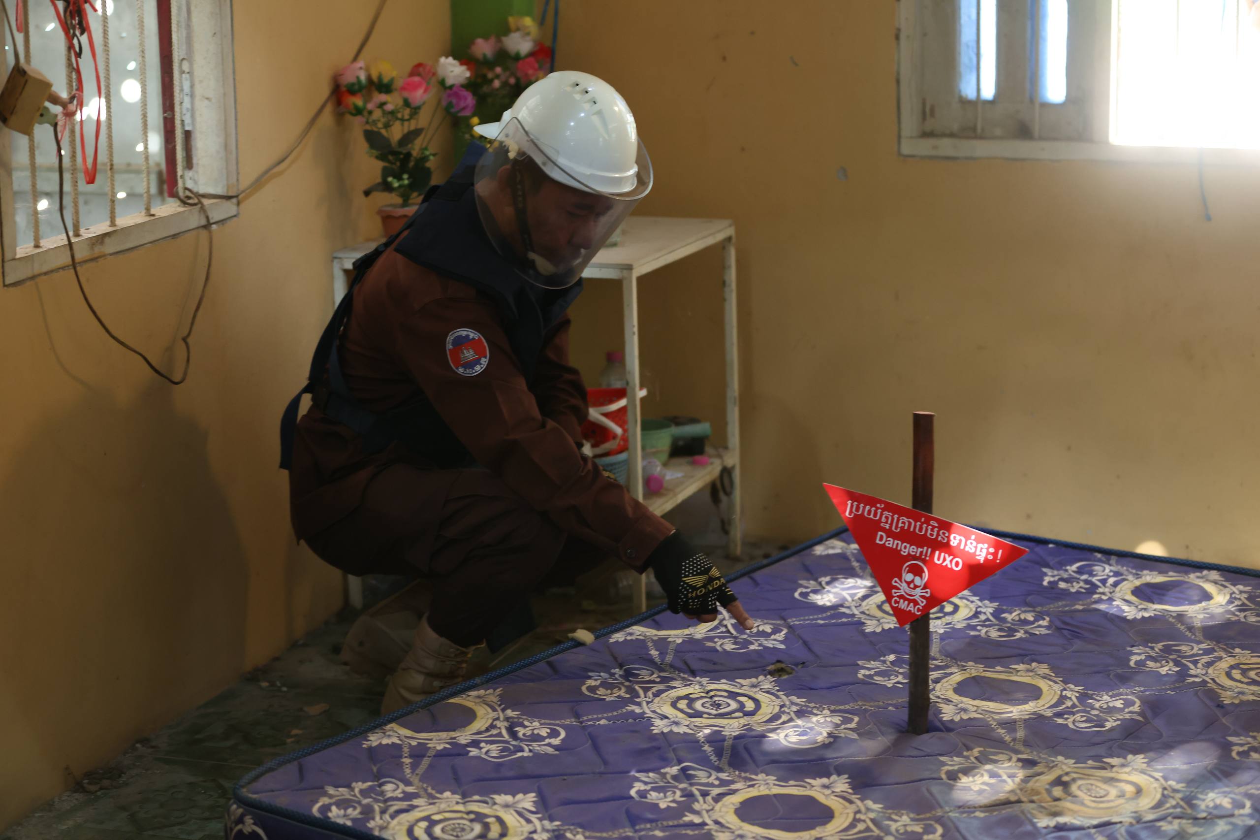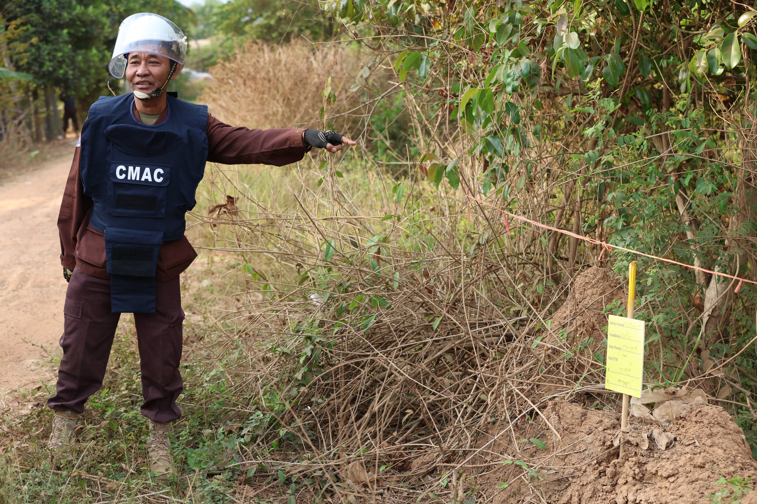 (AKP) លោកឧត្តមសេនីយ៍ត្រី នេត រដ្ឋា ប្រធានកងឯកភាពកំចាត់មីនទី១ នៃមជ្ឈមណ្ឌលសកម្មភាពកំចាត់មីនកម្ពុជា (CMAC) ធ្វើបទបង្ហាញទីតាំងរងផលប៉ះពាល់ដោយសារទម្ងន់គ្រាប់ផ្លោង និងគ្រាប់ទម្លាក់ពីយន្តហោះ រួមទាំងគ្រាប់បែកចង្កោមរបស់យោធាថៃ មកលើតំបន់ស៉ីវិលកម្ពុជា ស្ថិតនៅស្រុកអូរជ្រៅ ខេត្តបន្ទាយមានជ័យ នារសៀលថ្ងៃទី០៤ ខែកុម្ភៈ ឆ្នាំ២០២៦។