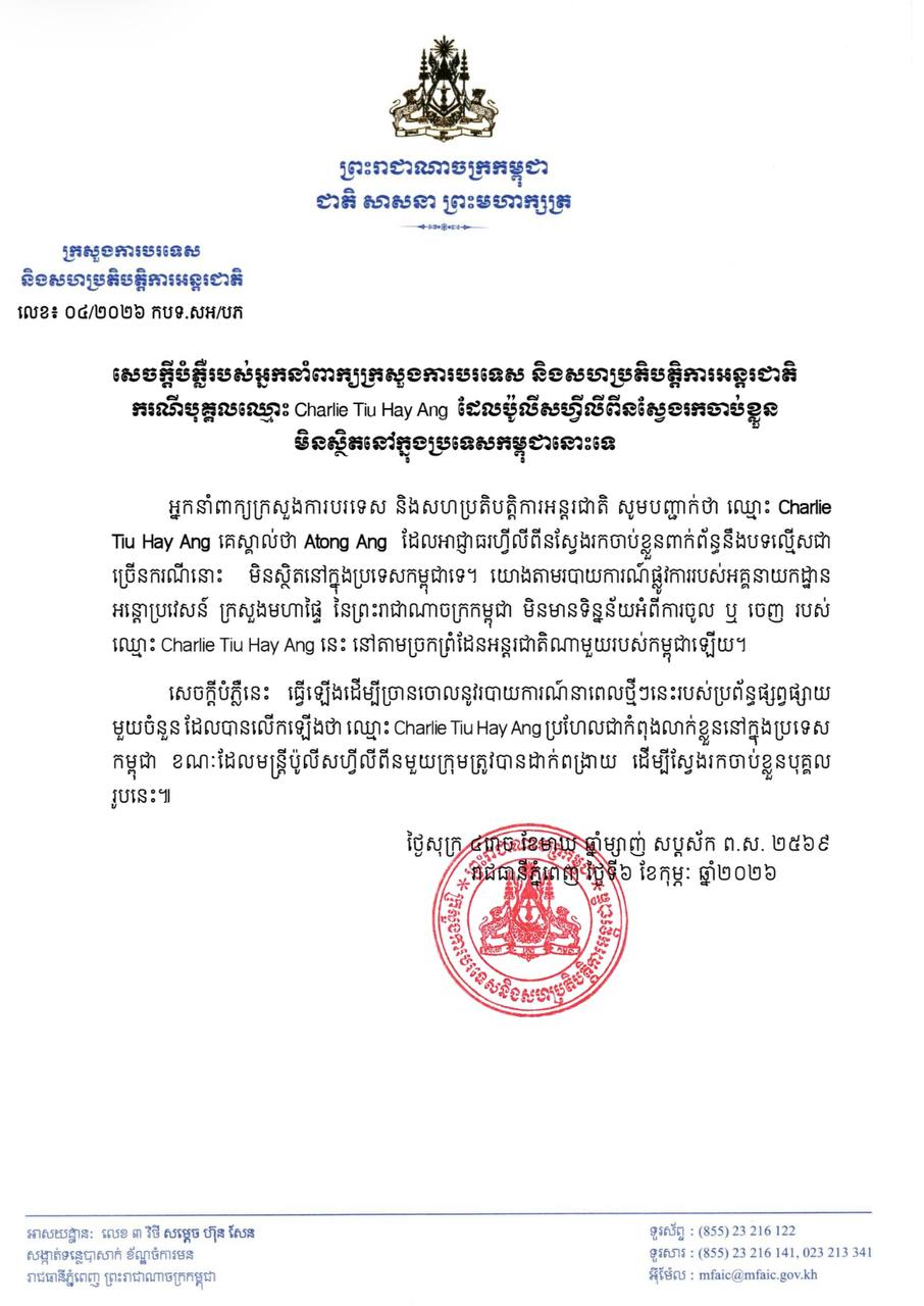 សេចក្តីបំភ្លឺនេះ ធ្វើឡើងដើម្បីច្រានចោលនូវរបាយការណ៍នាពេលថ្មីៗនេះរបស់ប្រព័ន្ធផ្សព្វផ្សាយ មួយចំនួន ដែលបានលើកឡើងថា ឈ្មោះ Charlie Tiu Hay Ang ប្រហែលជាកំពុងលាក់ខ្លួននៅក្នុងប្រទេសកម្ពុជា ខណៈដែលមន្ត្រីប៉ូលីសហ្វីលីពីនមួយក្រុមត្រូវបានដាក់ពង្រាយ ដើម្បីស្វែងរកចាប់ខ្លួនបុគ្គល រូបនេះ៕