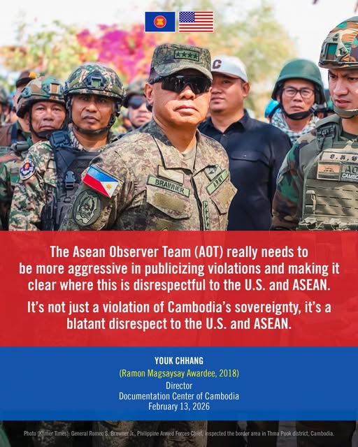 កាលពីថ្ងៃទី១៣ ខែកុម្ភៈ ឆ្នាំ២០២៦​អគ្គមេបញ្ជាការកងទ័ពហ្វីលីពីន លោក ROMEO S BRAWNER JR ក្នុងនាមប្រធាន​អាស៊ានប្តូរវេន បានចុះទៅ​ត្រួតពិនិត្យដោយផ្ទាល់នៅតំបន់ព្រំដែនក្នុងខេត្តបន្ទាយមានជ័យ។