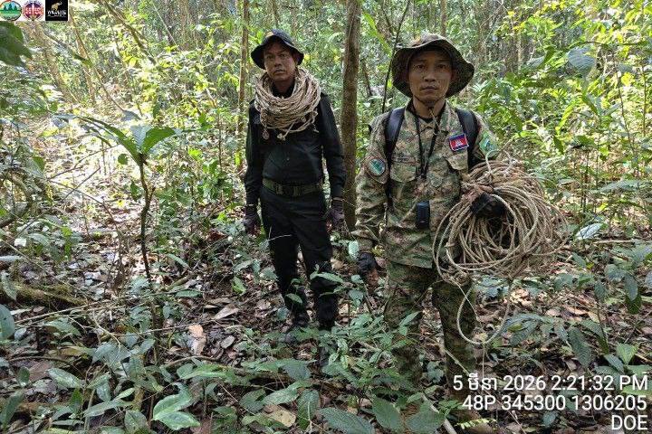 អន្ទាក់ចាប់សត្វជាច្រើនខ្សែ ត្រូវបានមន្ត្រីឧទ្យានុរក្ស និងកងរាជអាវុធហត្ថខេត្តកោះកុង ប្រមូលចេញពីក្នុងព្រៃ
