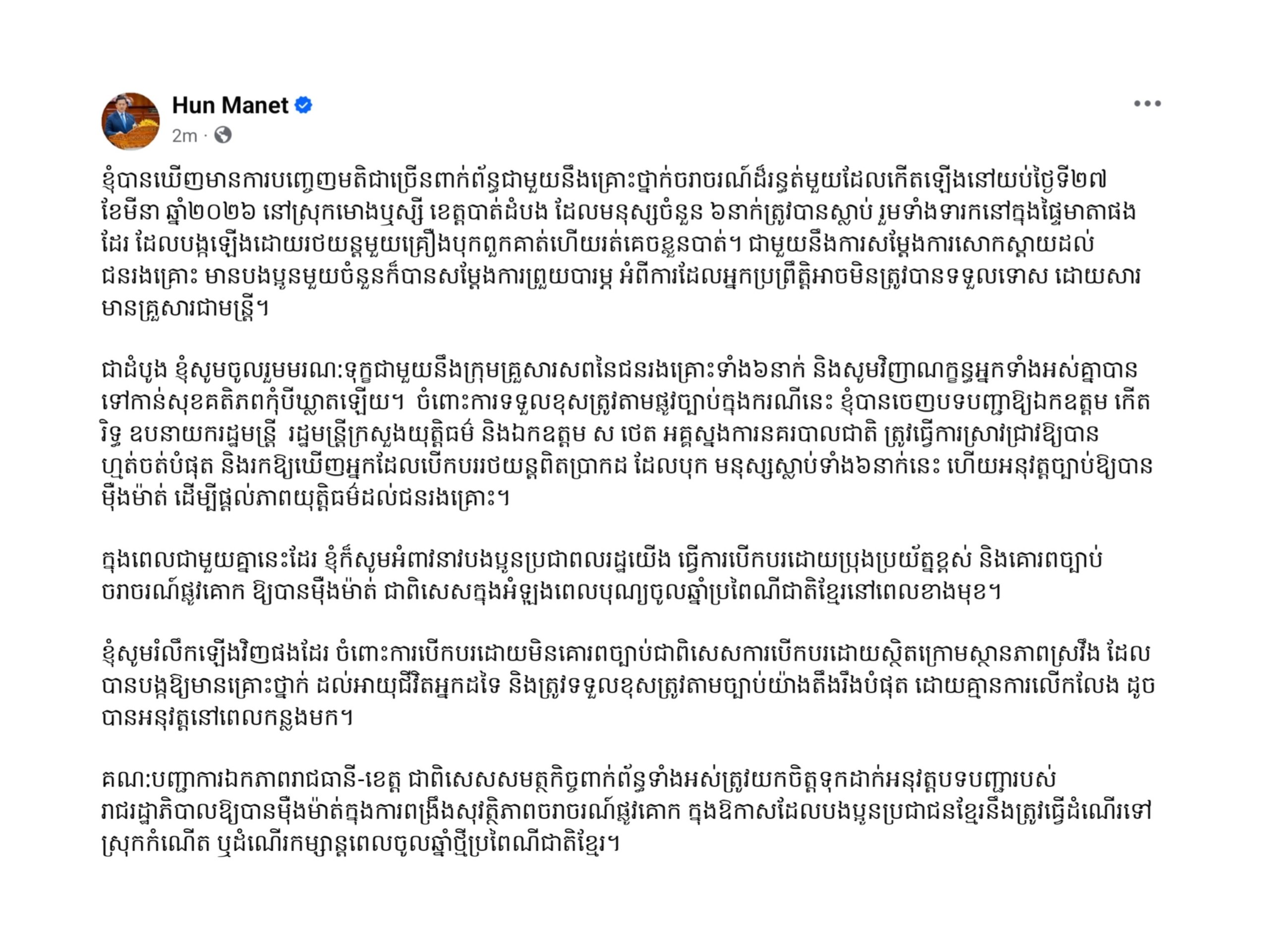 (ភ្នំពេញ)៖ តាមរយៈសំណេរបង្ហោះលើបណ្តាញសង្គមផ្លូវការ នៅព្រឹកថ្ងៃទី៣១ ខែមីនា ឆ្នាំ២០២៦នេះ សម្តេចបវរធិបតី ហ៊ុន ម៉ាណែត នាយករដ្ឋមន្ត្រីនៃកម្ពុជា បានចេញបទបញ្ជាឱ្យឧបនាយករដ្ឋមន្ត្រី កើត រិទ្ធ រដ្ឋមន្ត្រីក្រសួងយុត្តិធម៌ និងនាយឧត្តមសេនីយ៍ ស ថេត អគ្គស្នងការនគរបាលជាតិ ធ្វើការស្រាវជ្រាវឱ្យបានហ្មត់ចត់បំផុត និងរកឱ្យឃើញអ្នកបើកបររថយន្តពិតប្រាកដ ដែលបុកមនុស្សស្លាប់ទាំង៦នាក់ នៅស្រុកមោងឬស្សី ខេត្តបាត់ដំបង ដើម្បីផ្តល់យុត្តិធម៌ដល់ជនរងគ្រោះ។