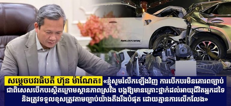 សម្តេចបវរធិបតី ហ៊ុន ម៉ាណែត៖ «ខ្ញុំសូមរំលឹកឡើងវិញ ការបើកបរមិនគោរពច្បាប់ ជាពិសេសបើកបរស្ថិតក្រោមស្ថានភាពស្រវឹង បង្កឱ្យមានគ្រោះថ្នាក់ដល់អាយុជីវិតអ្នកដទៃ និងត្រូវទទួលខុសត្រូវតាមច្បាប់យ៉ាងតឹងរឹងបំផុត ដោយគ្មានការលើកលែង»